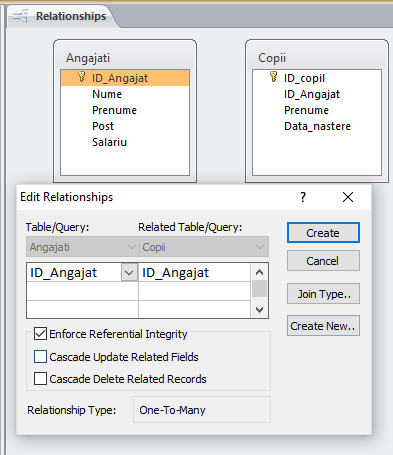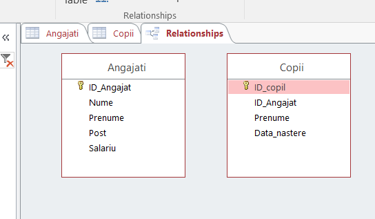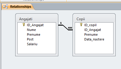 Pentru a stabili exact relaţia, adică pentru a specifica faptul că datele din câmpul ID_Angajat din ANGAJATI este replicată în ID_Angajat din COPII, mergem în ![]() Selectăm ambele tabele şi apăsăm Add, apoi Close.