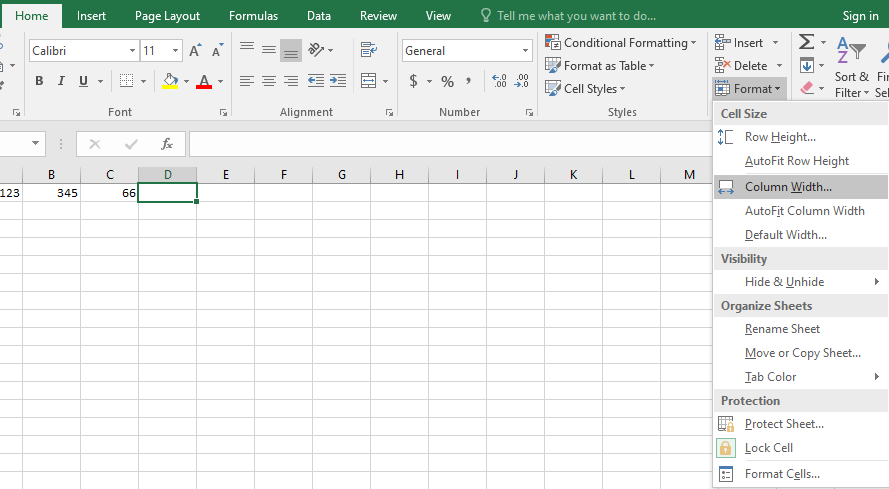 - Selectaţi celula → Pagina de pornire (Home) → grupul Celule (Cells) → Clic pe Formatare(Format) → Dimensiune celulă (Cell Size) → opţiunea Lăţime coloană (Column Width..) dă posibilitatea introducerii valorii de la tastatură, iar opţiunea Autofit Column Width potriveşte automat lăţimea coloanei la lungimea conţinutului:
