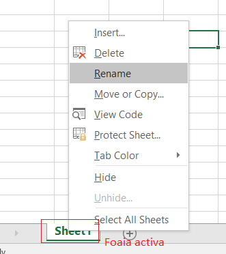- În bara Selectori foi, faceţi clic cu butonul din dreapta pe selectorul foii pe care doriţi să o redenumiţi, apoi clic pe Redenumire(Rename)