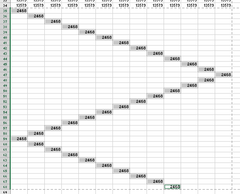 - Scrieţi în prima celulă numărul 13579 să copiaţi acest număr în toate coloanele de la A la M pe primele 34 de linii;
