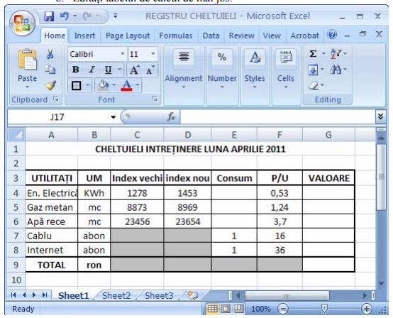 - Salvaţi fişierul cu numele REGISTRU CHELTUIELI.