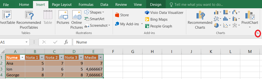 - Sau click în dreapta jos în grupul Diagrame (Charts) (cerculeţul roşu):