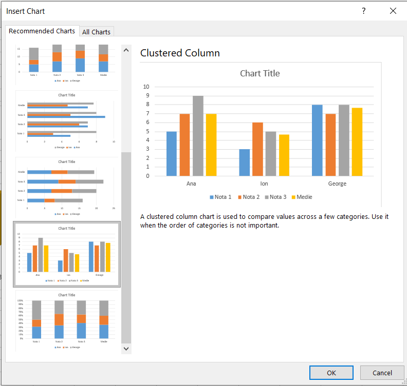 - În fila Inserare (Insert), în grupul Diagrame (Charts), faceţi clic pe grupul de diagrame dorit (Column, Line, Pie, Area, Scatter sau Other Chart) şi din lista afişată alegem tipul de diagramă dorit.