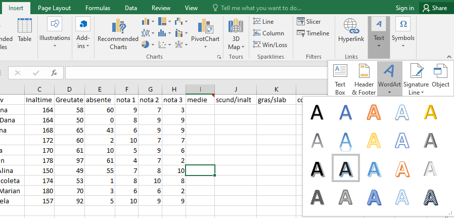 - În fila Inserare (Insert), în grupul Legături(Links), faceţi clic pe Text → WordArt apoi faceţi clic pe stilul dorit:
