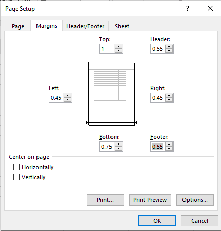 Setaţi prima foaie de calcul a agendei de lucru astfel: format A4; margini: sus 1, jos 0.75, stânga 0.45, dreapta 0.45; antet 0.55, subsol 0.55; orientare orizontală(Vedere)(Landscape).