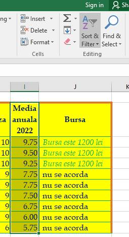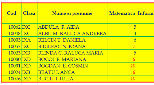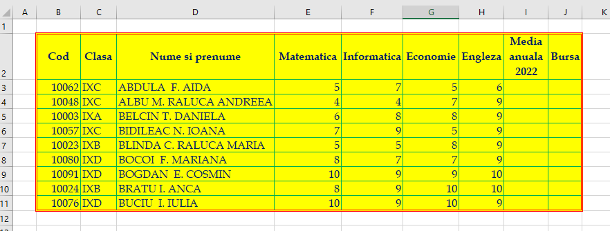 pentru elevii care primesc bursă aplicaţi un format condiţional astfel încât valorile care respectă condiţia să fie scrise cursiv cu culoarea verde;