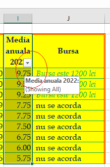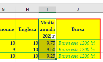 câmpul Bursa se va completa selectiv, în funcţie de valoarea corespondentă din câmpul Media conform relaţiei: dacă media>=9 atunci "Bursa este de 1200 lei", altfel "nu se acordă";