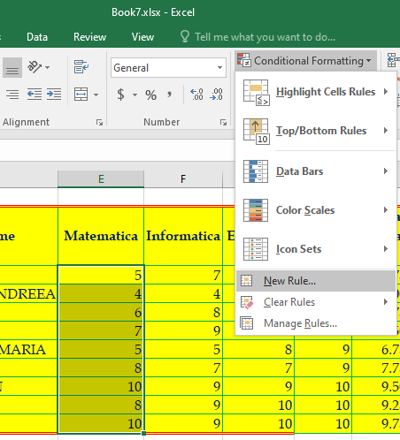 - În fila Acasă(Home), în grupul Stiluri(Styles), faceți clic pe Formatare condiționată(Conditional Formatting) --> Regulă nouă(New Rule)