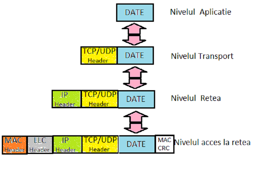 Protocolul TCP/IP este compus din patru niveluri: Aplicaţie, Transport, Reţea şi Acces la reţea.