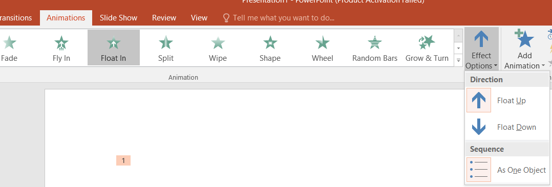 Clic pe obiectul dorit → fila Animaţii (Animation) →grupul Animaţii (Animation) → se alege un efect din listă → se selectează o optiiune pentru efect (Effect Options)
