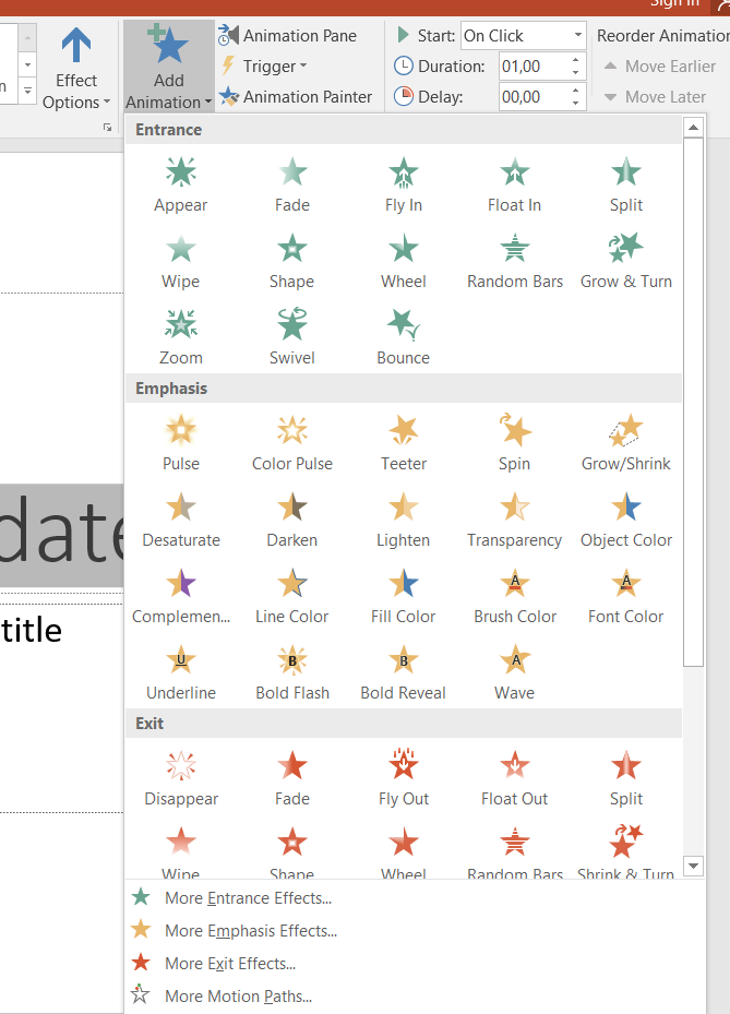 Clic pe obiectul dorit → fila Animaţii (Animation) →grupul Animaţii avansate (Advanced Animation) → Adaugă animatie (Add Animation) → se alege un efect din listă