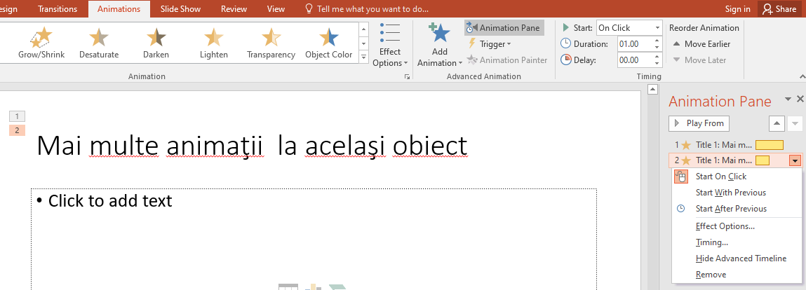 - Pentru a adăuga incă un efect de animaţie la acelasi obiect: