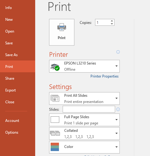 Fişier (File) → Tipărire (Print) → Selectăm imprimanta (Name …) → Selectăm diapozitivele tipărite (All sau Slides…) → Stabilim